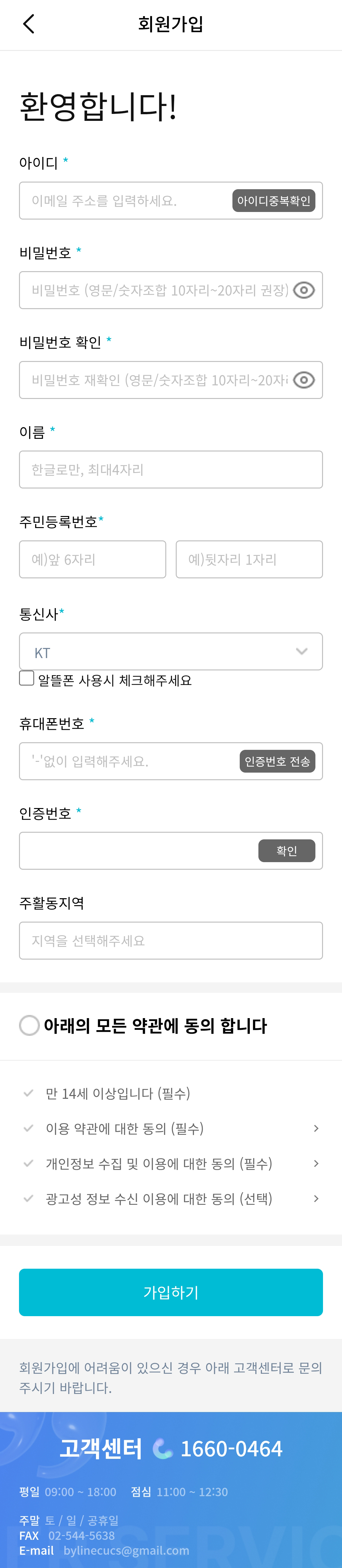 → 메인메뉴 버튼 터치 ▷ 회원가입 터치 → 우측 마이페이지 버튼 터치 ▷ 회원가입 터치
