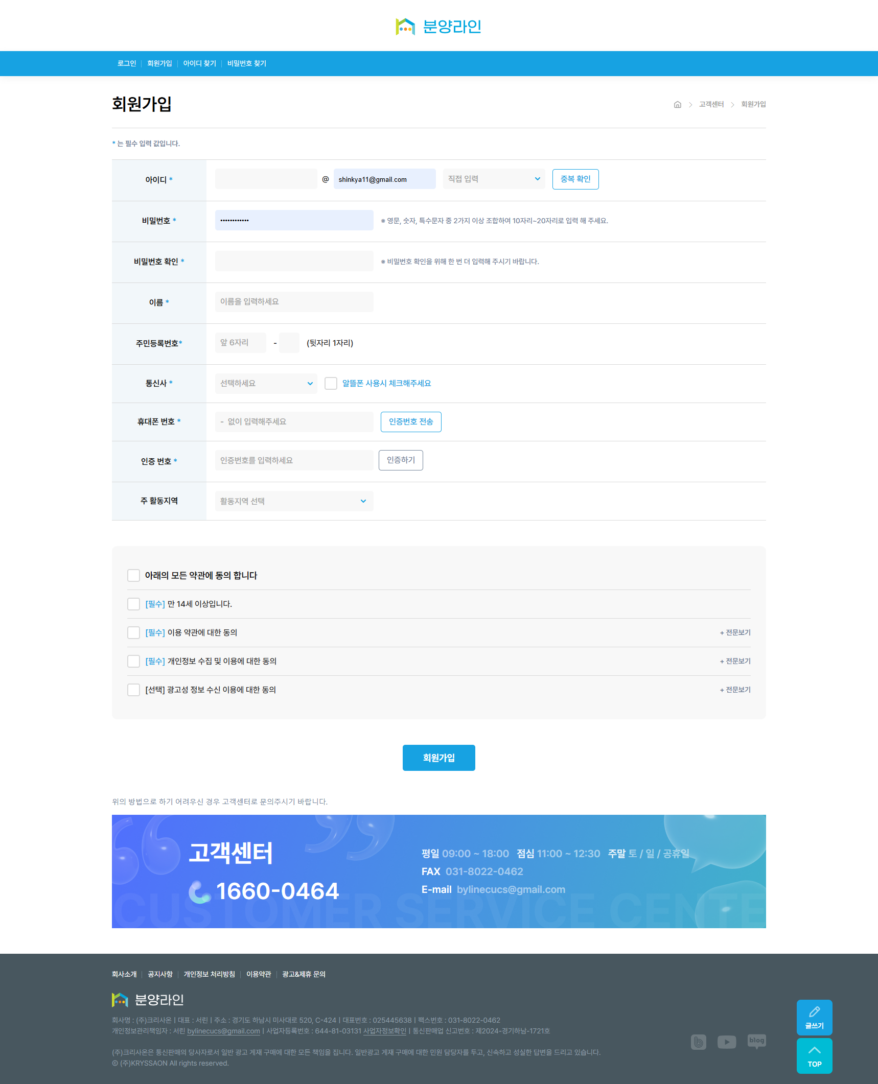→ 회원가입에 필요한 필수 기재사항은 * 표시가 되어있습니다. 양식에 맞게 기입하시어 가입을 진행해주시면 됩니다. [ PC ]
