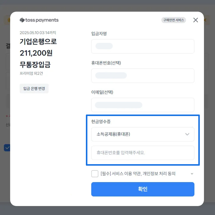 현금영수증 선택 ▷용도에 맞는 영수증 클릭